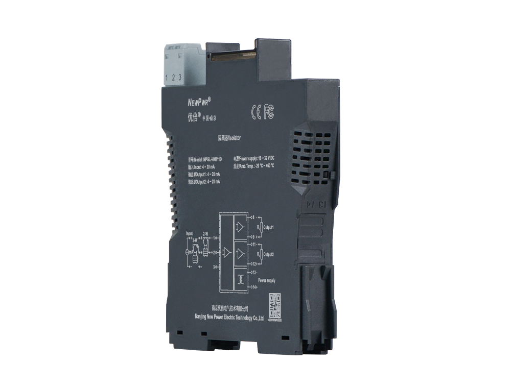 This isolator detects loop current and converts it to 4~20mA signals, and also provides transmitters with power. It allows transmission of HART communication signals. It needs a backplane power supply. The input, output, and power supply are galvanically isolated from each other.