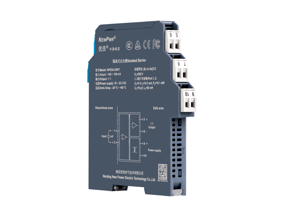 Millivolt input isolated barrier, it transfers the millivolt signals from a hazardous area to a safe area. It needs an independent power supply. The input, output, and power supply are galvanically isolated from each other. It has the function of setting over range output when the input is disconnected.