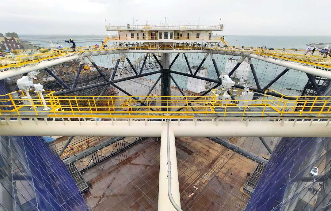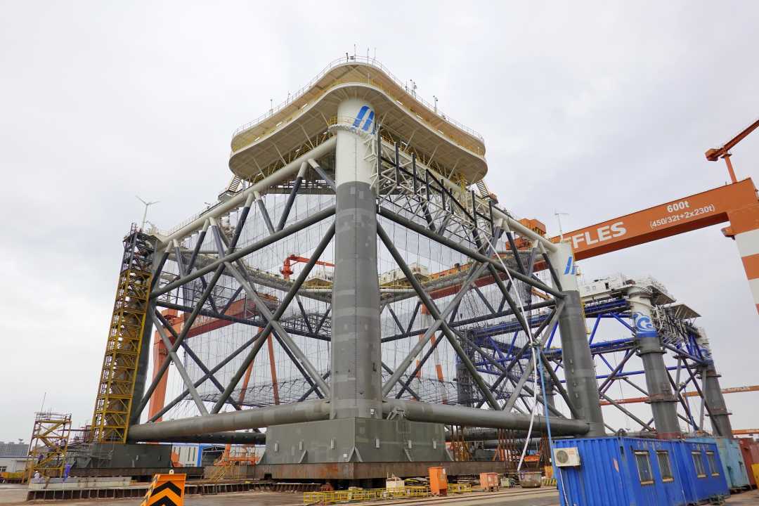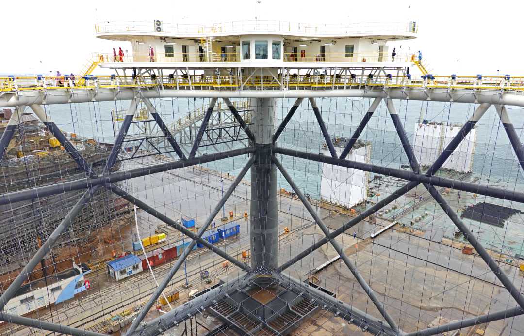 5月16日,在中集來福士山東龍口建造基地,“經海001號”深海智能網箱準備下水。