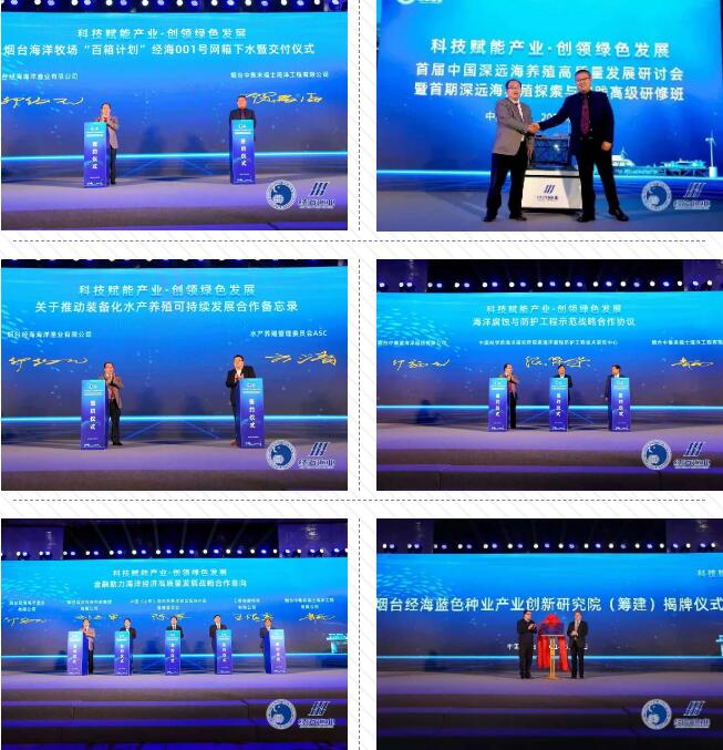 “百箱計劃”是煙臺市推動深遠海養殖的重要舉措,會議期間舉行了“百箱計劃”經海001號網箱下水暨交付儀式,“關于推動裝備化水產養殖可持續發展合作協議”“海洋腐蝕與防護工程示范戰略合作協議”“金融助力海洋經濟高質量發展戰略合作意向”三個項目簽約儀式,以及“煙臺經海藍色種業產業創新研究院(籌建)”揭牌儀式。