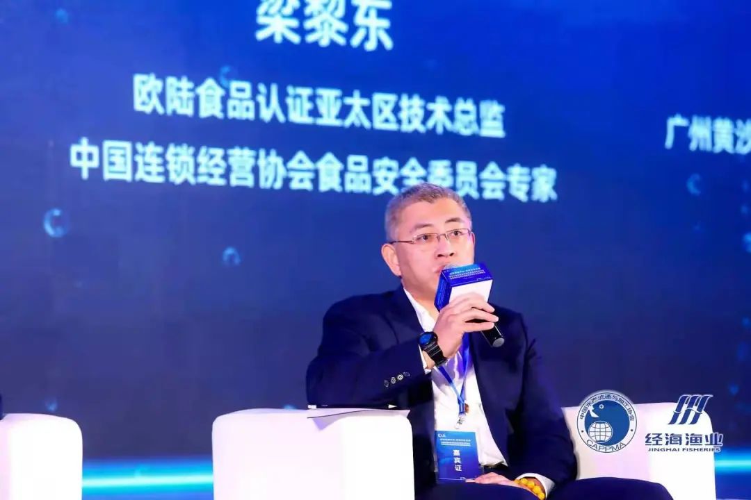 歐陸食品認證亞太區技術總監梁黎東對中國連鎖商超和餐飲對水產品的要求進行了介紹。他認為深遠海養殖要走品質化道路,需要優先考慮標準的制定和市場的開發,愿意與產業界共同推動深遠海養殖水產品標準的完善。