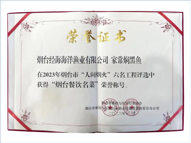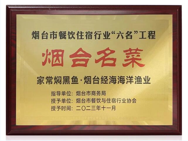 為了響應(yīng)煙臺市商務(wù)局啟動實(shí)施的“人間煙火”名店、名菜、名師、名宴、名點(diǎn)、名小吃“六名工程”評選認(rèn)定工作,推動魯菜傳承與創(chuàng)新。煙臺市餐飲與住宿行業(yè)協(xié)會經(jīng)過近半年的篩選、大眾美食家的推薦及專家評委的綜合評定,活動現(xiàn)場對評選出的“煙臺餐飲名店”、“煙臺餐飲名菜”、“煙臺餐飲名點(diǎn)”、“煙臺餐飲名小吃”、“煙臺餐飲名宴”、“煙臺餐飲名師”頒發(fā)了獎(jiǎng)牌和證書。煙臺經(jīng)海海洋漁業(yè)有限公司憑借一道“家常燜黑魚”入選“2023年六名工程‘煙臺餐飲名菜’”,為打造煙臺魯菜品牌,擦亮“中國魯菜之都”金字招牌貢獻(xiàn)一份力。