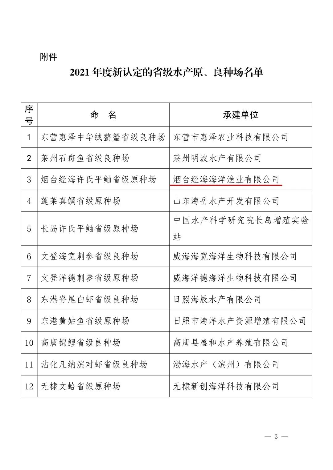 根據山東省農業農村廳2021年12月17日公布的“2021年度新認定省級水產原、良種場”通知,煙臺經海海洋漁業有限公司獲批“煙臺經海許氏平鲉省級原種場”。