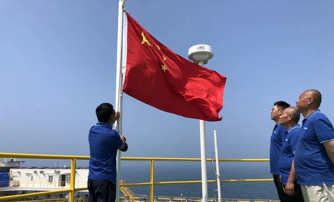 在“經海001號”和"經海002號"深遠海智能養殖平臺,駐守平臺的員工分別舉行了升旗儀式,鮮艷的五星紅旗伴隨著雄壯的《義勇軍進行曲》在平臺冉冉升起。