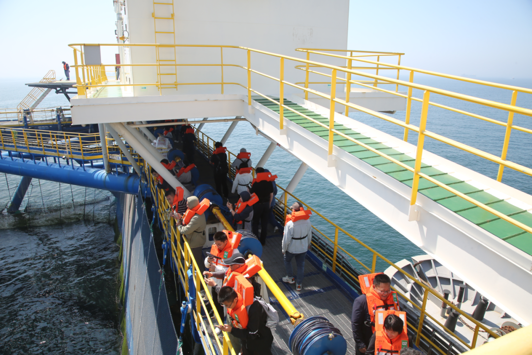 本次考察走進煙臺經海深遠海養殖基地,嘉賓們一路欣賞在蔚藍海面成群結隊盤旋飛翔的海鷗,體驗大自然的饋贈,駛向經海智能化深遠海網箱。