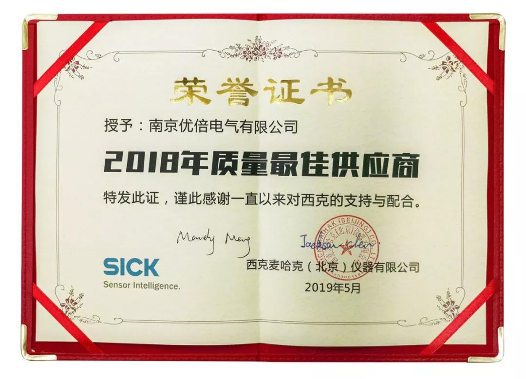 近日,西克麥哈克(北京)儀器有限公司首屆供應商大會在北京朗麗茲西山花園酒店舉行,向南京優倍電氣有限公司授予 “2018年度質量最佳供應商”稱號。這是本次大會所授予的唯一質量獎,肯定了優倍電氣隔離器、安全柵、電涌保護器等產品的性能、品質的穩定性與可靠性。