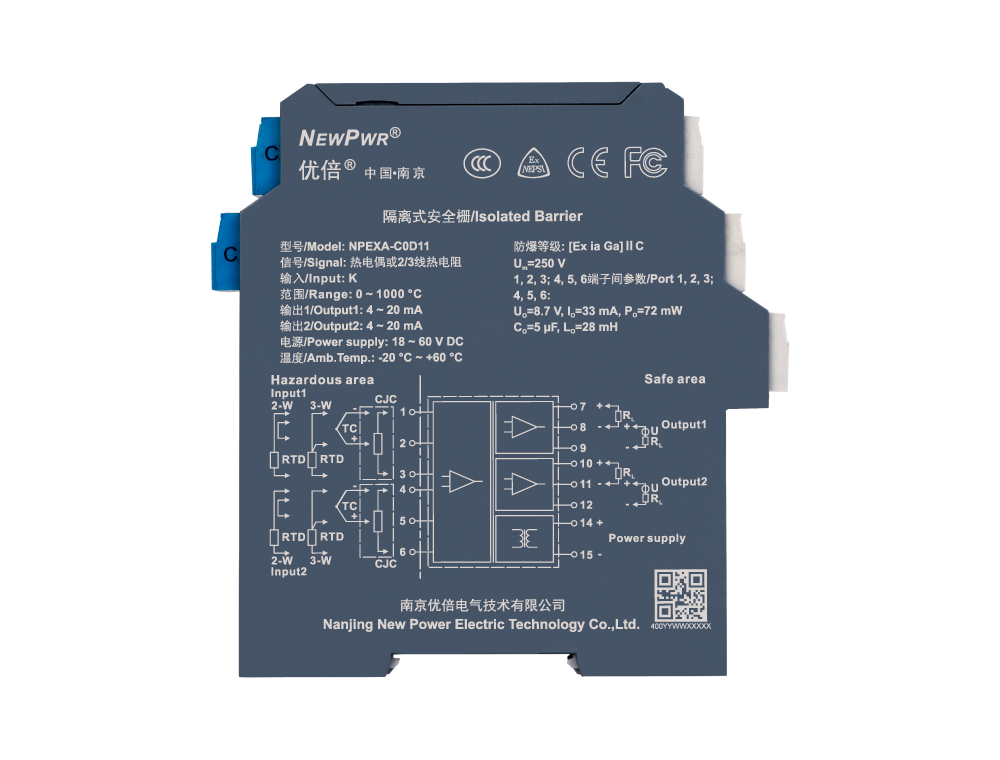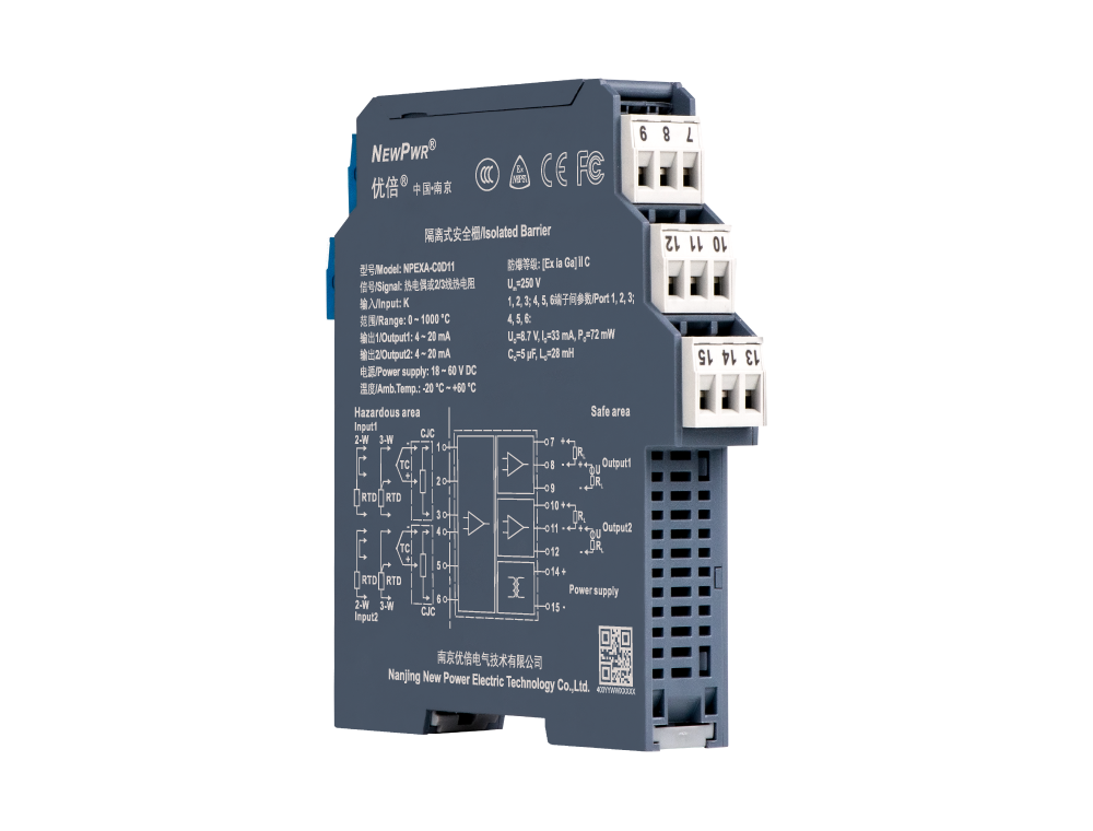 溫度型輸入安全柵,將危險(xiǎn)區(qū)的熱電偶、熱電阻信號(hào),經(jīng)隔離轉(zhuǎn)換為4~20mA電流信號(hào)輸出到安全區(qū)(其他輸出信號(hào)類型產(chǎn)品,具體型號(hào)見型譜),外置冷端補(bǔ)償端子。該產(chǎn)品需要獨(dú)立供電,輸入、輸出和電源三端隔離,具有在線故障自診斷功能,可以通過PC端或手持編程器對(duì)溫度量程、信號(hào)類型等進(jìn)行組態(tài)設(shè)置。